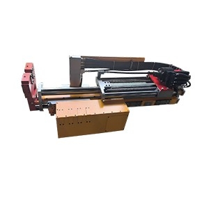 ②一级、二级推进机构:推进机构由1根套筒油缸组成,一路液压油控制,内活塞杆和内缸筒组成一级推进机构,控制推进总成在导柱上滑动;内缸筒和外缸筒组成二级推进机构,控制旋转机构在导轨上滑动,内置位移传感器